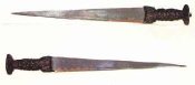 Les épées à deux mains étaient déjà utilisées par les combattants européens avant le XVe siècle. Le type écossais de cette arme, caractérisée par une extrémité en quatre lobes et une garde entièrement ajourée, s'est développé durant le siècle suivant. Des épées avec de telles poignées sont rares, mais sont représentées sur les tombes de l'Ouest des Highlands. Elles sont connues sous le nom de Claymores ( du gaélique Grande épée). Le nom est parfois utilisé pour les épées plus courtes qui leur ont succédé, qui pourraient être plus correctement décrites comme des épées à poignées en corbeille.