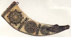 Ce cornet est en corne de vache, chauffée pour que celui qui l'a fabriqué puisse l'aplatir, puis décorée à l'aide d'une combinaison de motifs celtes et Renaissance, comme on en trouve sur les cornets à poudre allemands et hollandais.