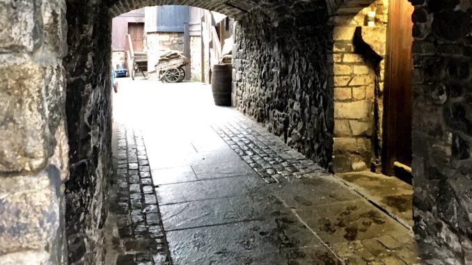 L'impasse a été utilisée pour l'imprimerie mais également pour représenter les rues d’Édimbourg. Plus important peut-être, c’est le lieu de la maison de passe où se trouve Jamie, juste en face de l’imprimerie. Il s'avère que le bâtiment en question était autrefois un véritable bordel, connu sous le nom de Cock and Trumpet.