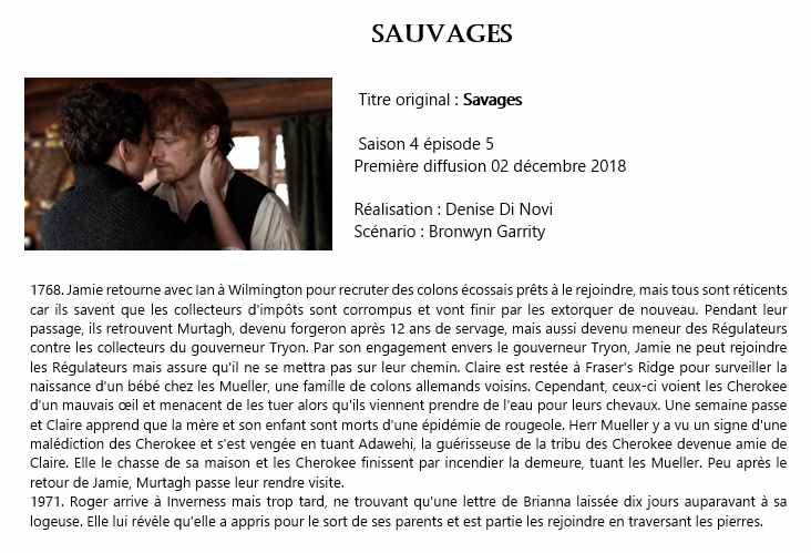 A la suite d’un naufrage en mer, Claire et Jamie ont échoué dans les colonies américaines où ils vont tenter de reconstruire leur vie.