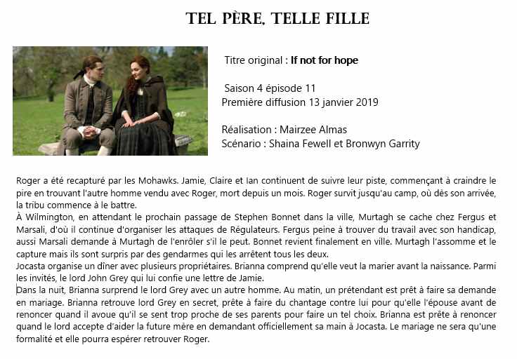Encore et toujours confrontés à une réalité politiques conflictuelle, ils devront pactiser avec l’envahisseur britannique pour bénéficier de terres fertiles sur lesquelles bâtir leur maison. Mais la révolte gronde et Claire bien sûr, en connait l’issue. A nouveau, ils vont devoir choisir entre l’histoire écrite et leur rêve de tranquilité.