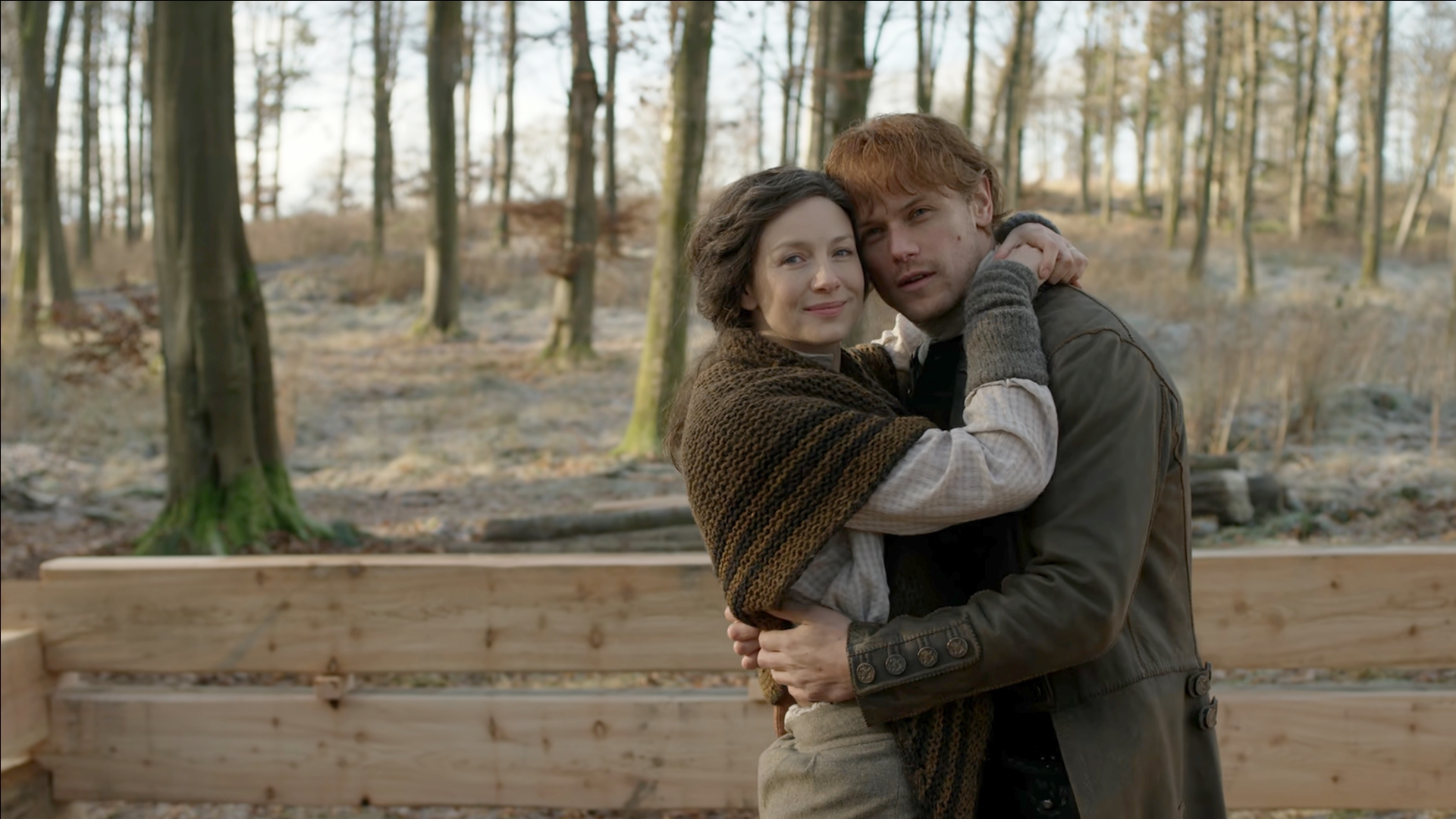 - 41 - Ayant entendu du bruit, Claire, Jamie et Ian sortent de leur cabane.
