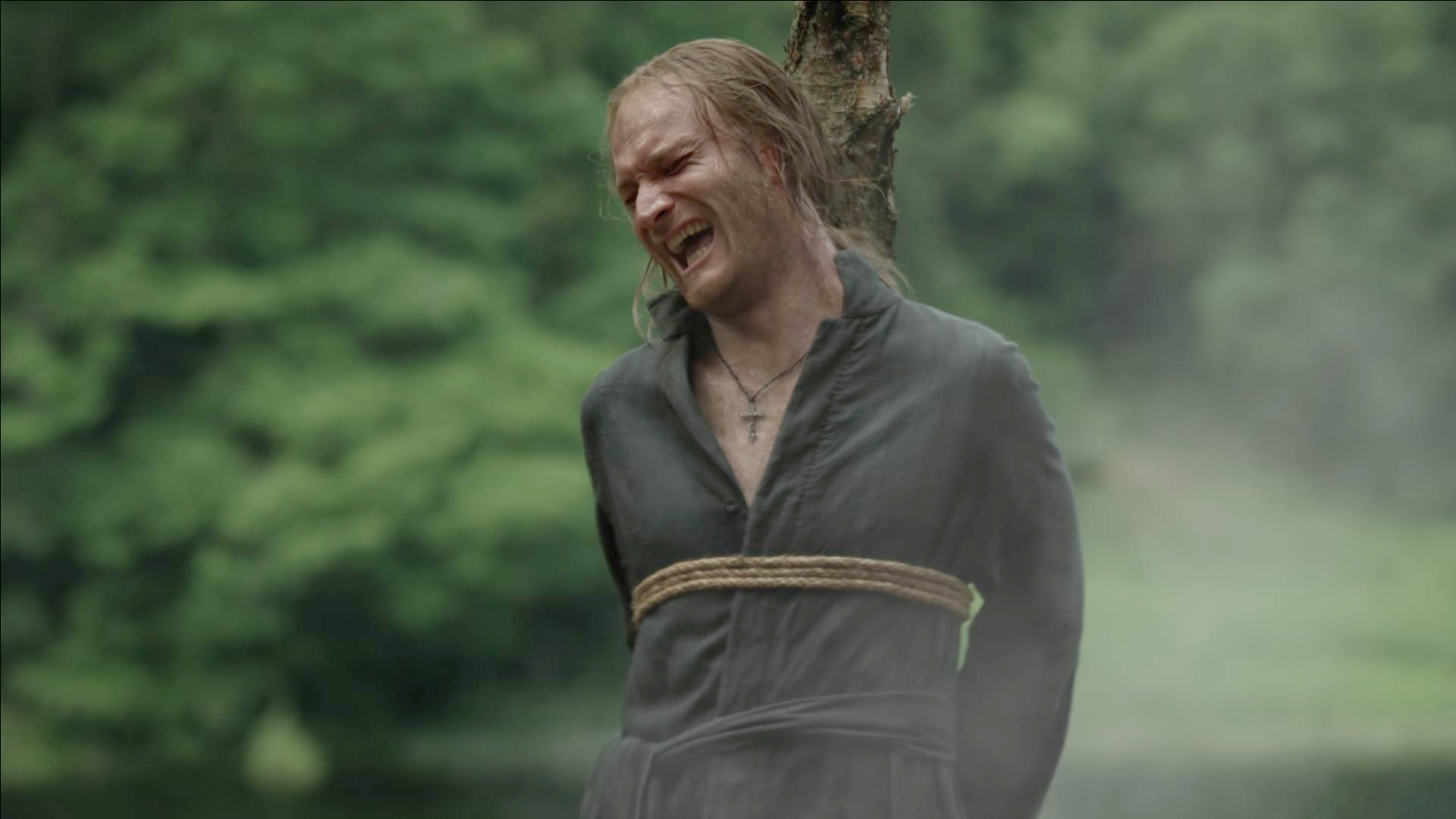 - 79 - Roge se chache derrière un arbre et repère des barils de poudre. Il en lance un sur le bûcher qui s'enflamme enfin, libérant le prêtre de la torture.