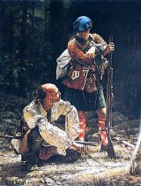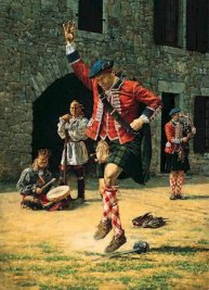 Robert Griffing montre un soldat du 42e régiment des Highlands dans les murs de Fort Ticonderoga. Selon la tradition du clan, si un danseur touchait les épées sous ses pieds pendant la danse, cela annoncerait la fin de la bataille. Un joueur de cornemuse fournit la musique. Un guerrier iroquois regarde, attendant les résultats.