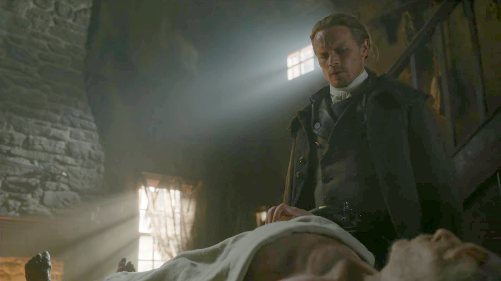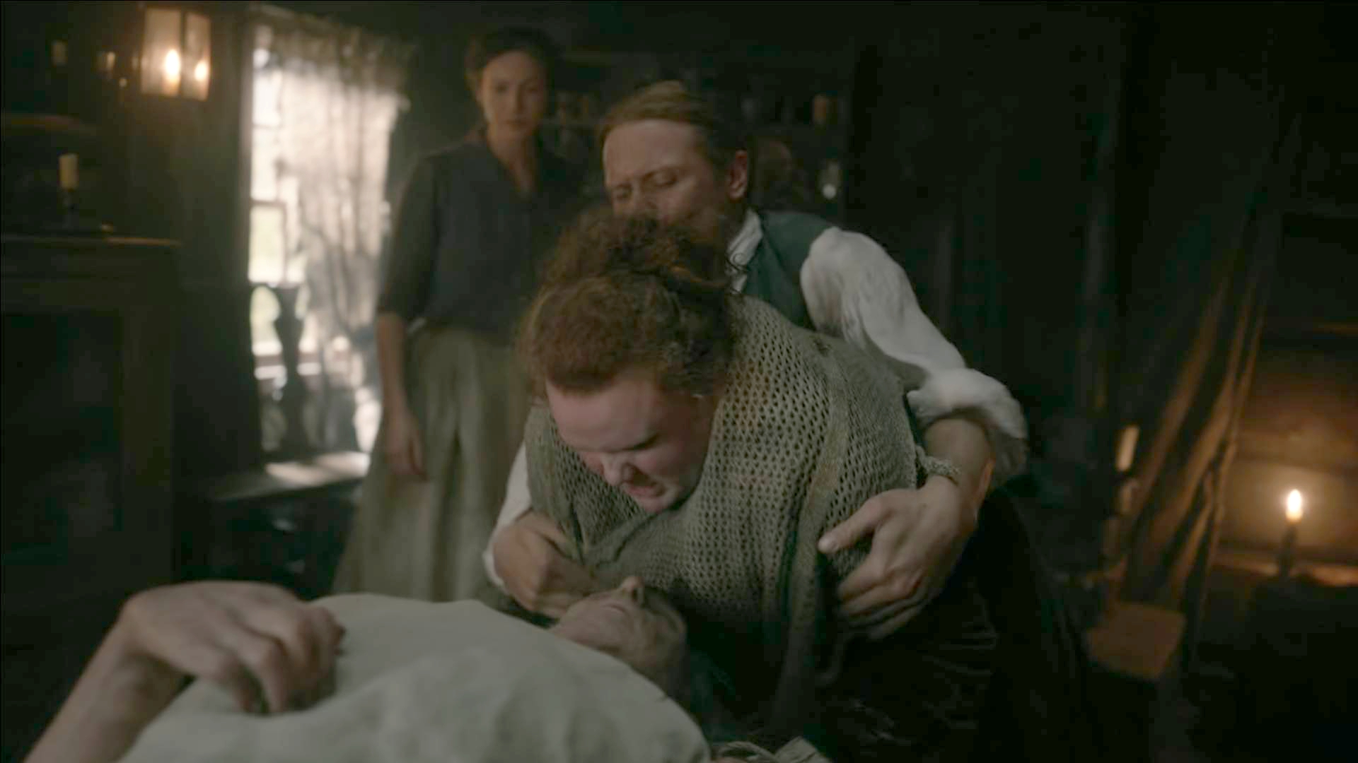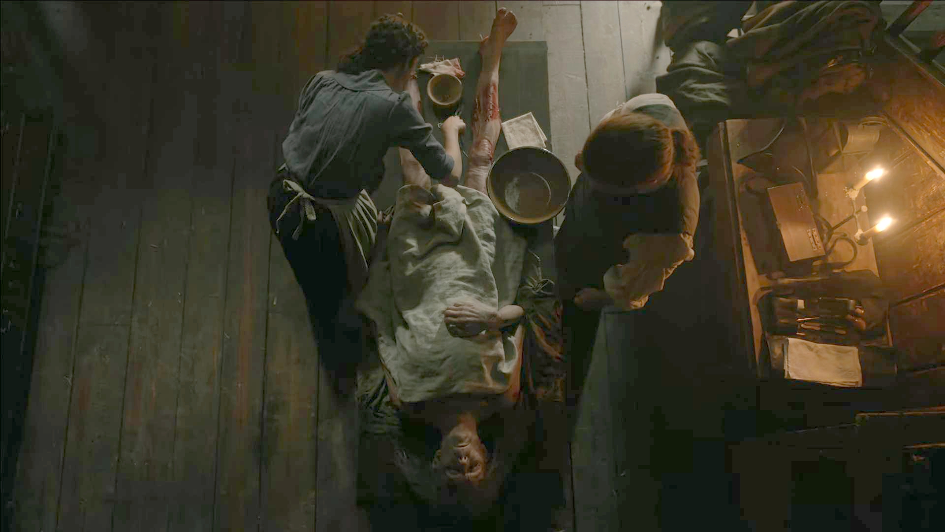 - 42 - Claire voudrait lui couper l'une de ses jambes atteinte par la gangrène. Jamie lui dit qu'ils n'ont pas le temps.