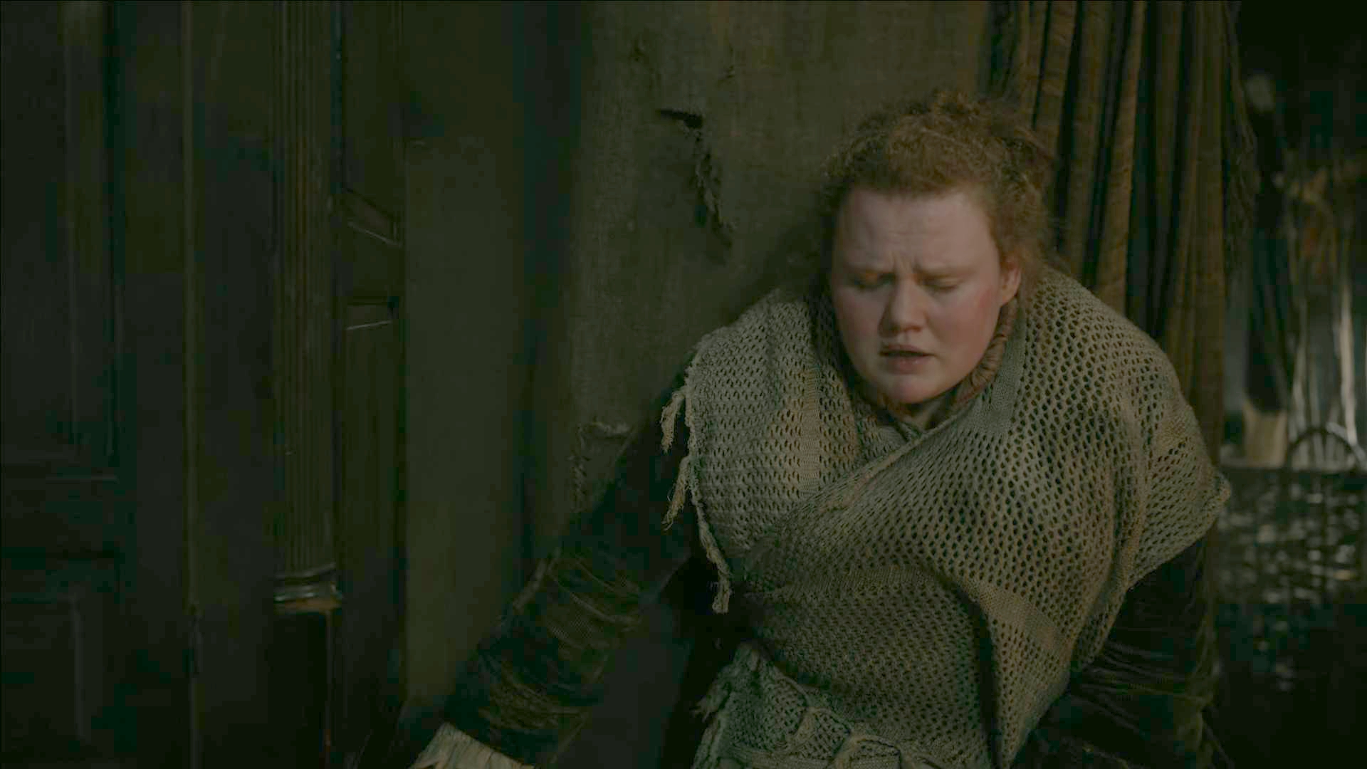 - 44 - En l'en empêchant, Jamie la projette contre un mur. Elle perd les eaux. Elle va accoucher.